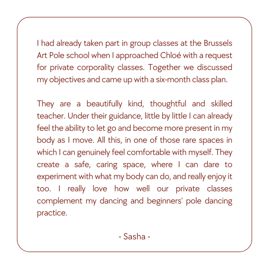 Mes tarifs comprennent la location de la salle. Ils dépendent aussi de l’implication nécessaire en dehors des moments de cours. Par exemple si je te crée une chorégraphie pour un mariage ou autre évènement, la création en amont sera facturée.